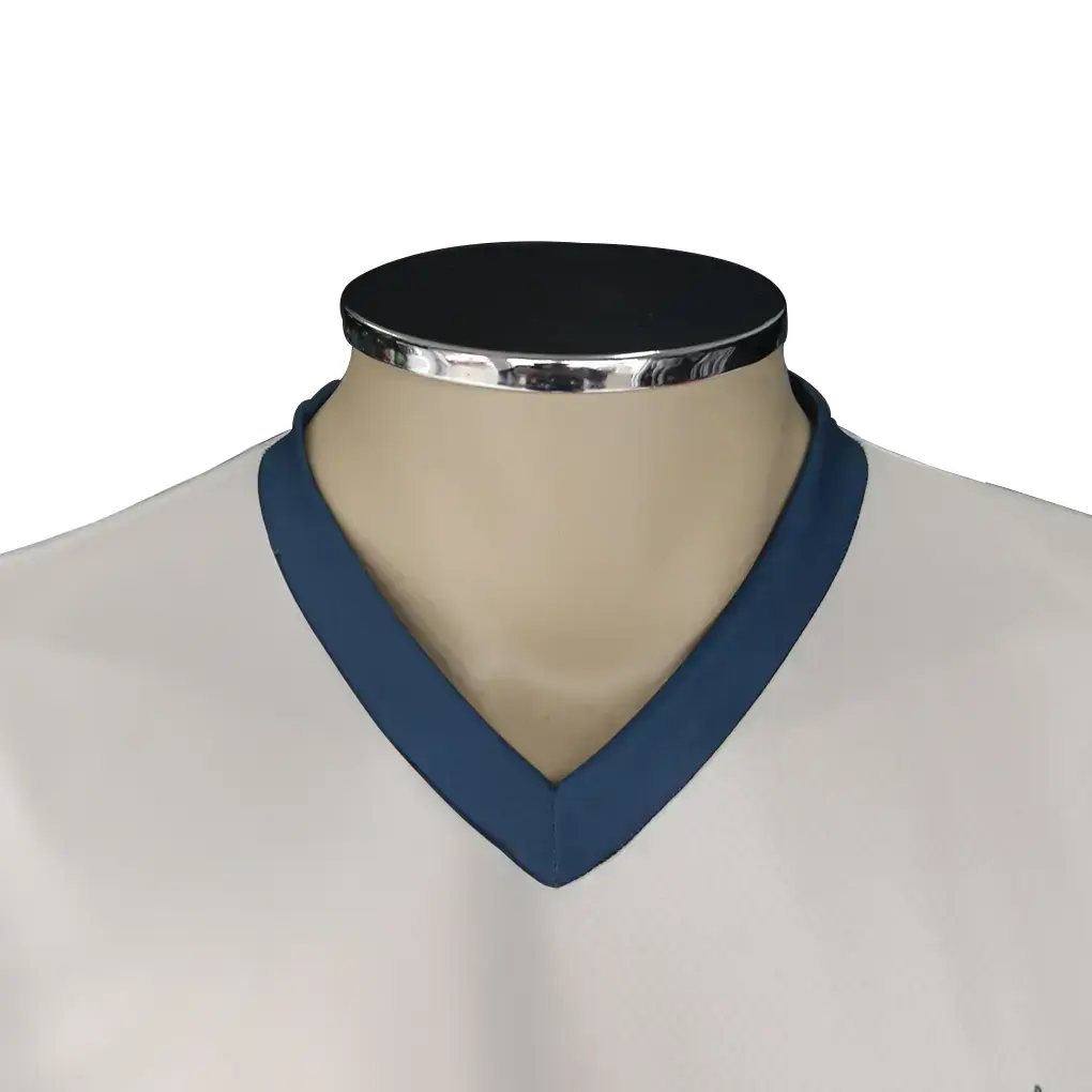 A gola em V sob medida da ASA Sports é aplicada com aparelho e finalizada com acabamento manual no vértice do “V”, assegurando encontro perfeito, largura constante e costura precisa. O resultado é caimento limpo, distribuição homogênea e aparência profissional em toda a grade de tamanhos.