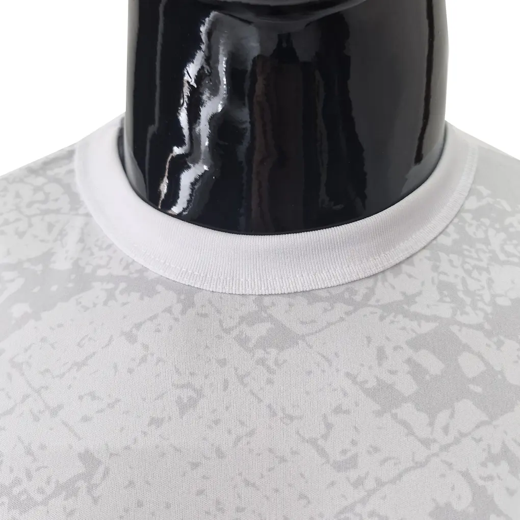 Fabricamos a gola com a mesma malha da camisa e aplicamos entretela estruturada e macia. Isso garante estabilidade, conforto e durabilidade.