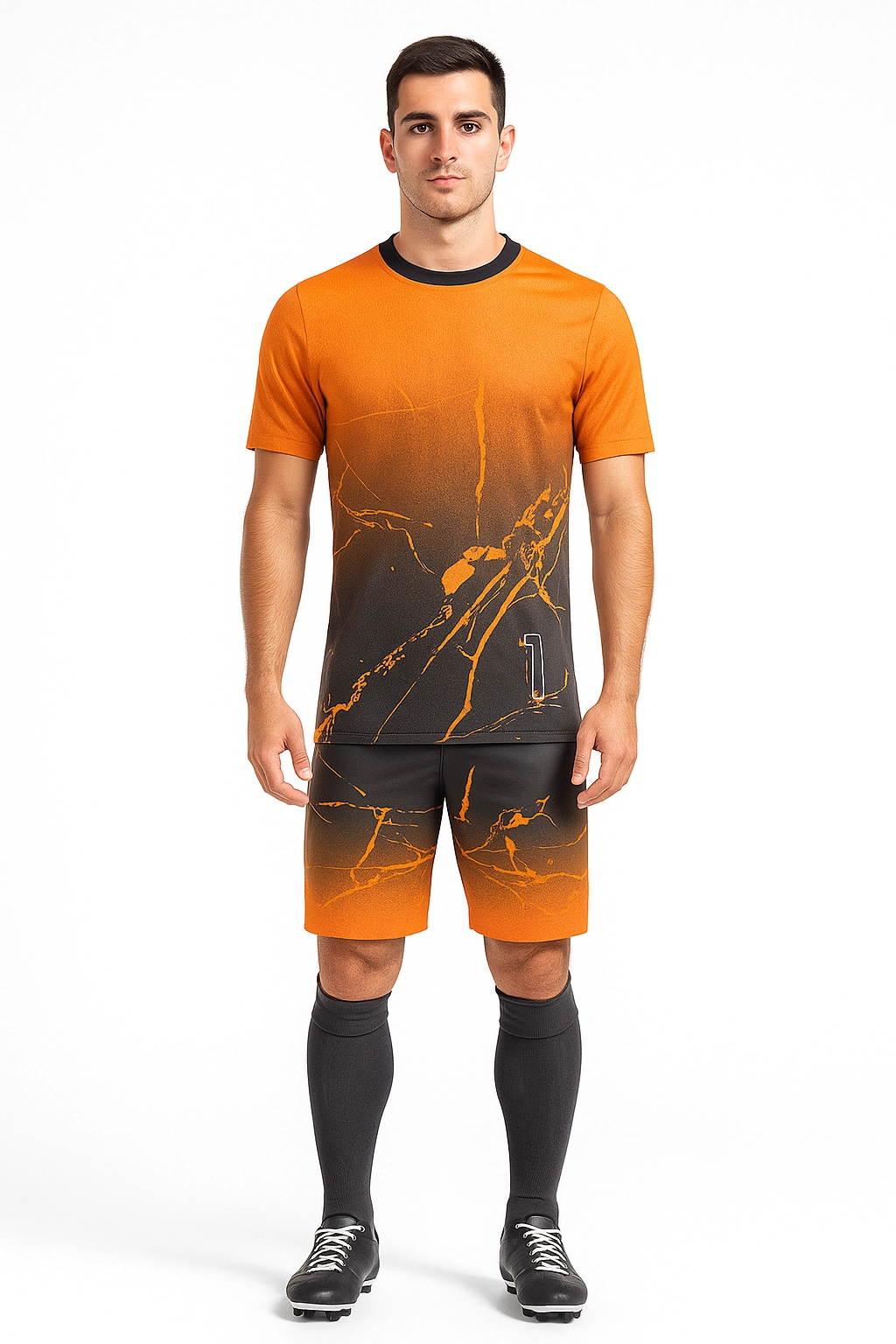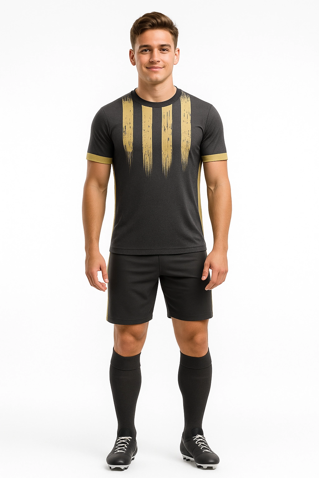 O Fardamento GOLD inclui camisa numerada, calção e meião, feito em malha dry de alta qualidade, toque macio e caimento perfeito. O cliente escolhe entre gola V ou redonda e cocriamos o layout para sublimação total em alta definição.